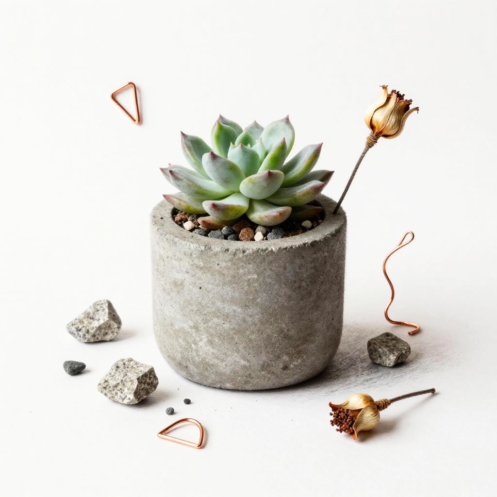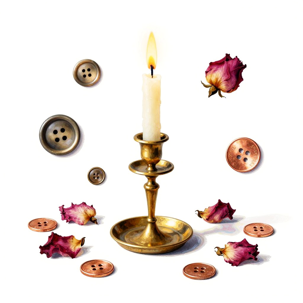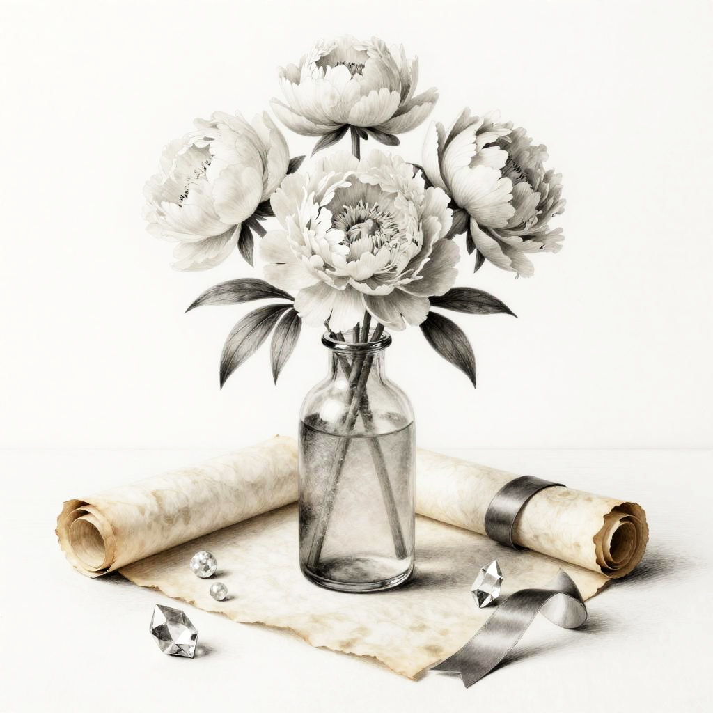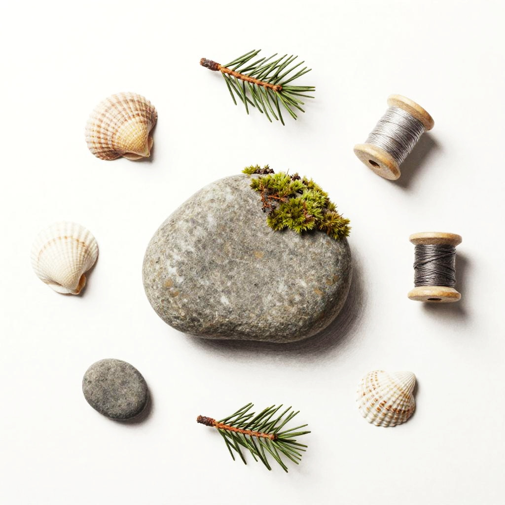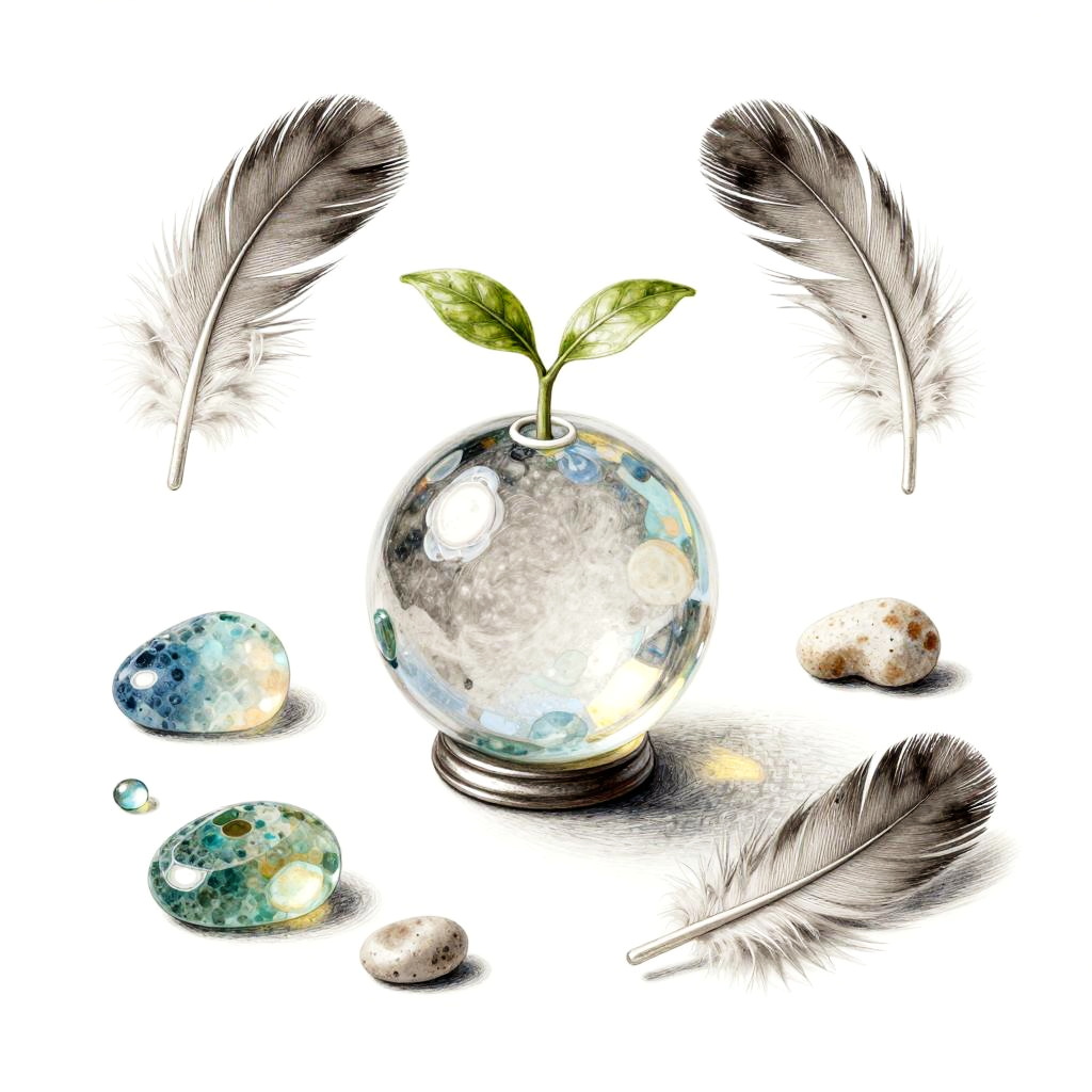 Whimsical still life rendered as a silverpoint drawing. At the center, a handblown glass orb with a delicate sprout anchors the composition. Scattered around are sea glass, drifting feathers, small pebbles, arranged playfully while keeping a clean backdrop, lively textures, soft cast shadows, balanced layout, charming details, handcrafted feel, and an inviting mood.