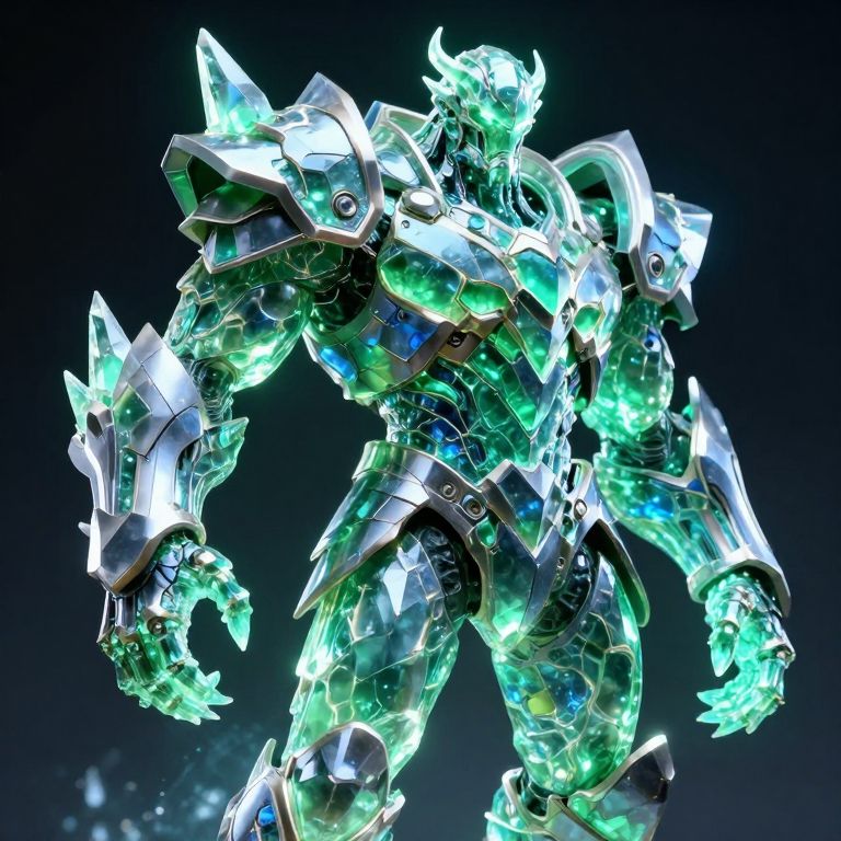 Glowing, crystalline, robotic warrior with green and blue energy accents, sharp metallic armor, and horn-like structures, set against a dark background