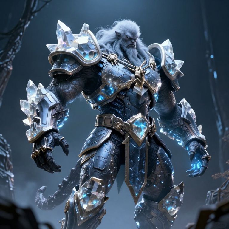 The image depicts a monstrous mutant barbarian, a creature made of glowing crystal power, encased in a suit of cyber slate armor. The armor is intricately designed with sharp, jagged edges and a metallic sheen, reflecting the ethereal glow of the crystal within. The barbarian's body is composed of shimmering, translucent crystal, with a vibrant green and blue energy pulsing through its veins, creating a mesmerizing visual effect. The armor's plates are meticulously aligned, forming a protective shell that encases the barbarian's form, while the crystal energy within adds a dynamic, almost otherworldly quality to the character. The overall composition is striking, with the barbarian standing in a powerful, commanding pose, the interplay of light and shadow accentuating the intricate details of the armor and the glowing crystal.