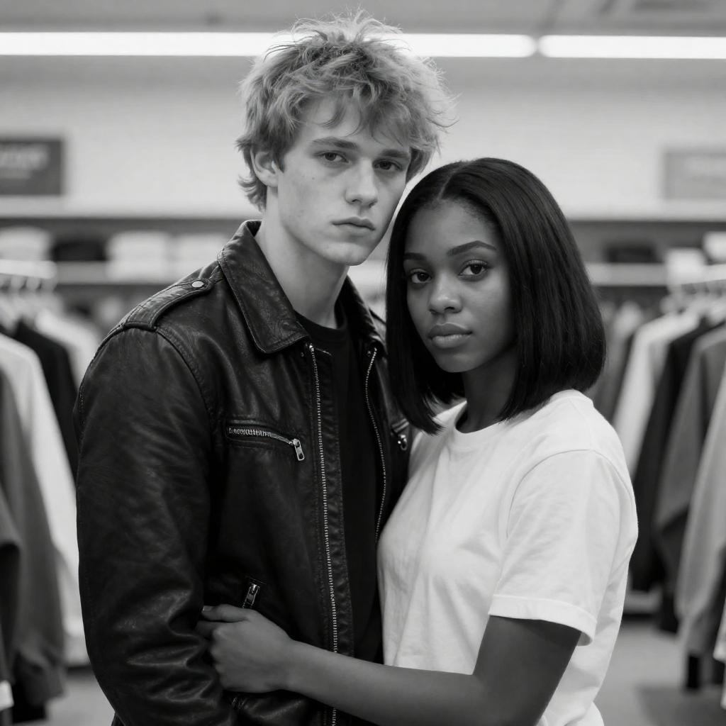 Black-and-white photograph of a young white man with shaggy hair and a black leather jacket, embracing a young Black woman with straight black hair and a white shirt. They stand closely in a store with blurred clothing racks in the background. The man's arm is around her waist, and she looks directly at the camera with a serious expression.