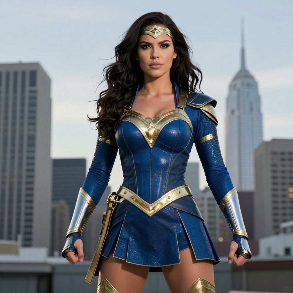 This stunning image features a woman dressed as a powerful superhero, exuding confidence and strength against a striking city skyline. Her elaborate blue and gold costume, inspired by iconic superhero themes, highlights her heroic presence and sets a dramatic tone for the scene.