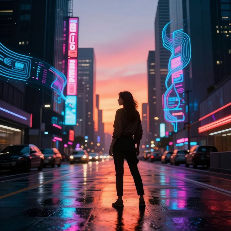 Alicia renato standing in a futuristic city at sunset, neon lights reflecting on wet streets, cyberpunk atmosphere with flowing holographic signs and smart city infrastructure, detailed lighting and vibrant color contrast