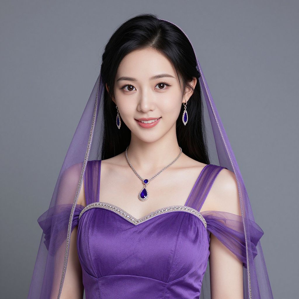 Ariel purple dress costume, 1girl, jewelry, solo, earrings, realistic, black hair, necklace, dress, looking at viewer, veil, purple dress, upper body, grey background, smile
