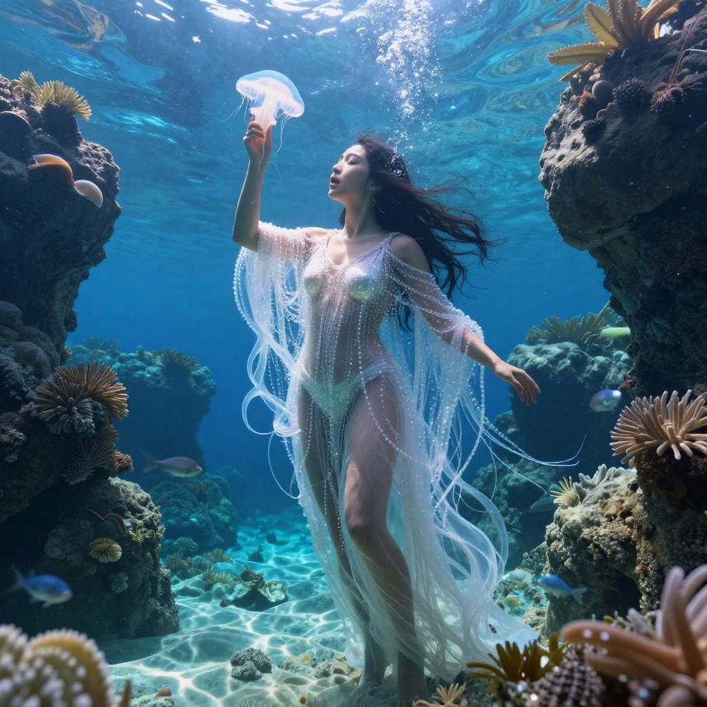 Sedna – Inuit goddess of the sea and marine life, portrayed as a formidable deity adorned with armor of coral and ice shards, her presence fierce and protective, heralding the guardianship of maritime creatures, standing in an ancient volcanic underwater ridge surrounded by fumaroles and teeming with bioluminescent sea animals pulsing with energy.