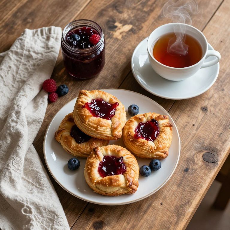 Top view of a rustic wooden table set for breakfast featuring cruasanes, fresh berries, a glass jar of jam, and a steaming cup of tea, natural light casting soft shadows, cozy farmhouse aesthetic with textured linen napkins
