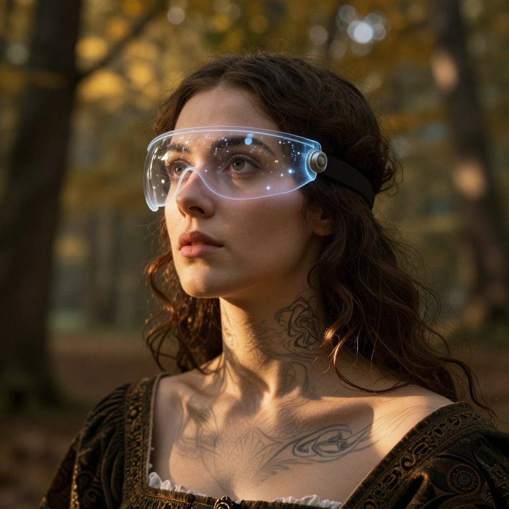Craft an image that blends Renaissance portraiture with modern digital artistry, capturing a close-up of a woman whose face is partially obscured by a high-tech visor glowing with ethereal light. The setting is the serene twilight in a forest, where golden sunlight filters through leaves, casting intricate shadows and revealing a mesmerizing tattoo on her neck. Her expression is a captivating mix of curiosity and detachment, inviting viewers to ponder her enigmatic nature as she stands at the intersection of ancient tradition and futuristic innovation, her visage illuminated by the interplay between natural beauty and advanced technology.