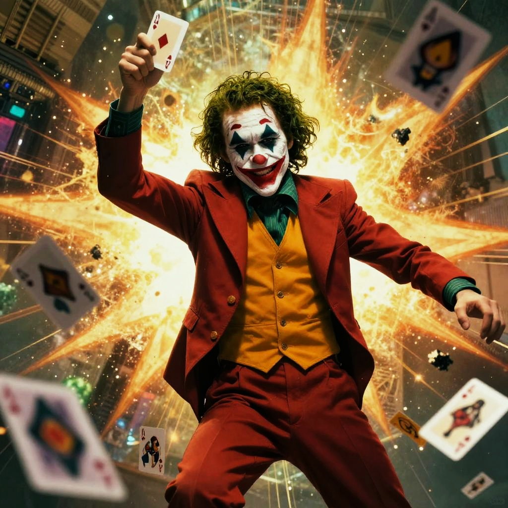The Joker holding card mid-action, throwing it with a smirk, swirling chaos around, comic book explosion effect, saturated colors, cinematic perspective, high energy composition