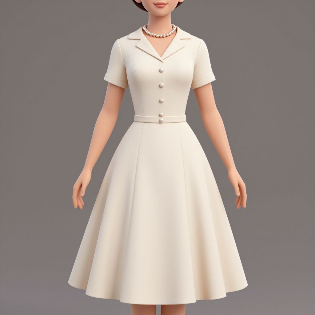 A vintage-inspired 3D render showcases a woman in a classic 1950s cream dress with short sleeves and a fitted bodice adorned with pearl buttons, complemented by a full skirt and accessorized with a pearl necklace, embodying the elegance and sophistication of mid-century fashion trends.