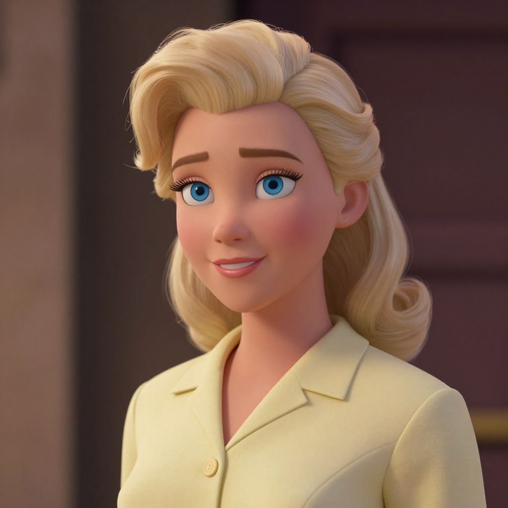 3D-rendered woman in a white, short-sleeve, button-up, flared dress with a V-neck, wearing a pearl necklace,