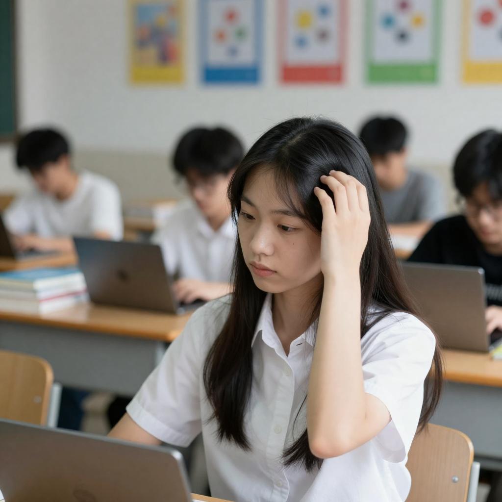 Young woman with long black hair, white shirt, right hand touching head, focused expression, seated in classroom. Background: blurred students, laptops, stacked books, colorful posters on gray walls. Multiple people, casual attire, sitting at desks.
