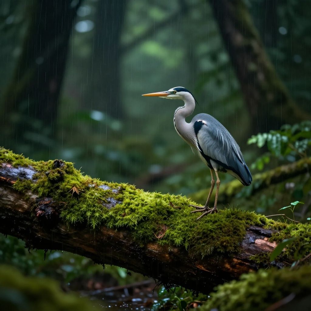Photograph of a tall heron standing on a moss-covered, fallen tree branch in a dense, rain-soaked forest. The heron has a white neck and head with a black stripe running from its beak to the back of its head, and its body is covered in grey feathers with black wingtips. The background is blurred, showcasing tall, dark tree trunks and a green, forest canopy. Raindrops are visibly falling, adding a sense of motion to the serene, damp environment. The heron's yellow beak and legs stand out against the green and brown moss and tree bark.