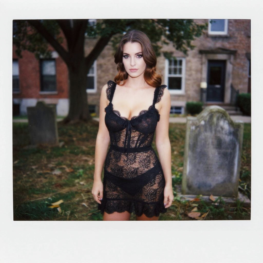 Photograph of a young woman with fair skin and wavy auburn hair standing in a cemetery. She wears a black lace dress with a deep V-neck, showcasing her cleavage, and lace trim on the straps and hem. The background features old stone buildings with large windows, and several weathered gravestones. The woman has a serious expression and stands centered in the frame, with a slightly blurred, overgrown grassy area and tree in the background. The image has a white border.