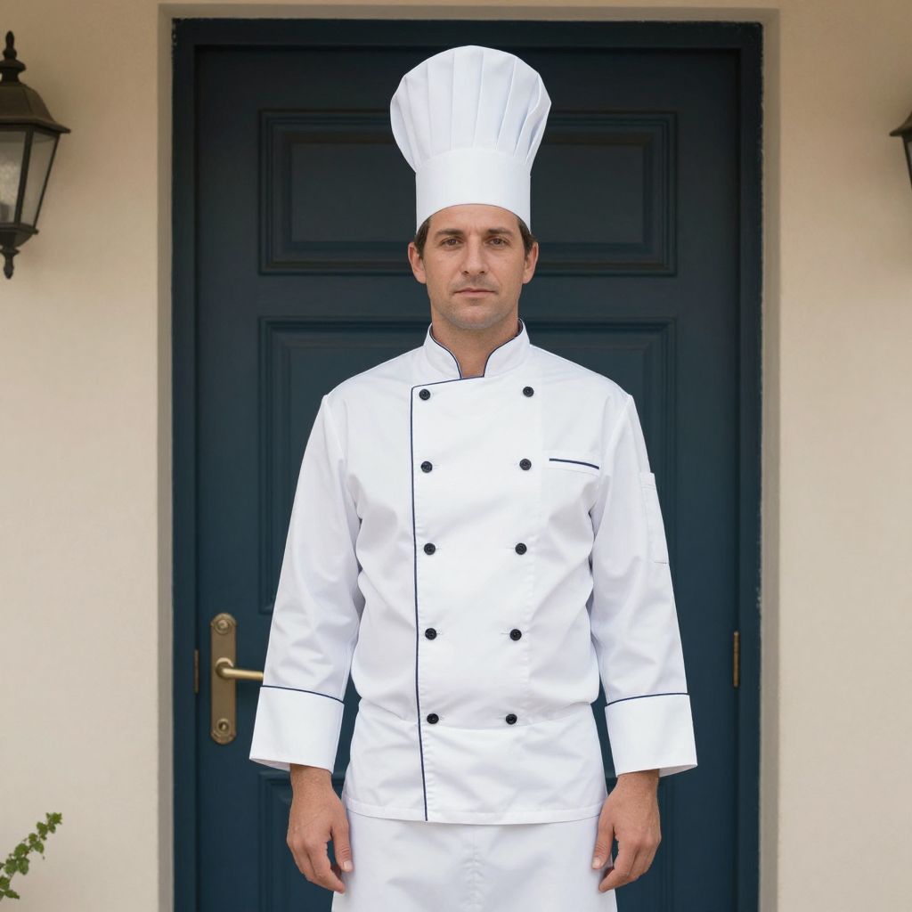 Photograph of a middle-aged male chef standing in front of a dark blue door, wearing a white double-breasted chef's jacket and tall hat,