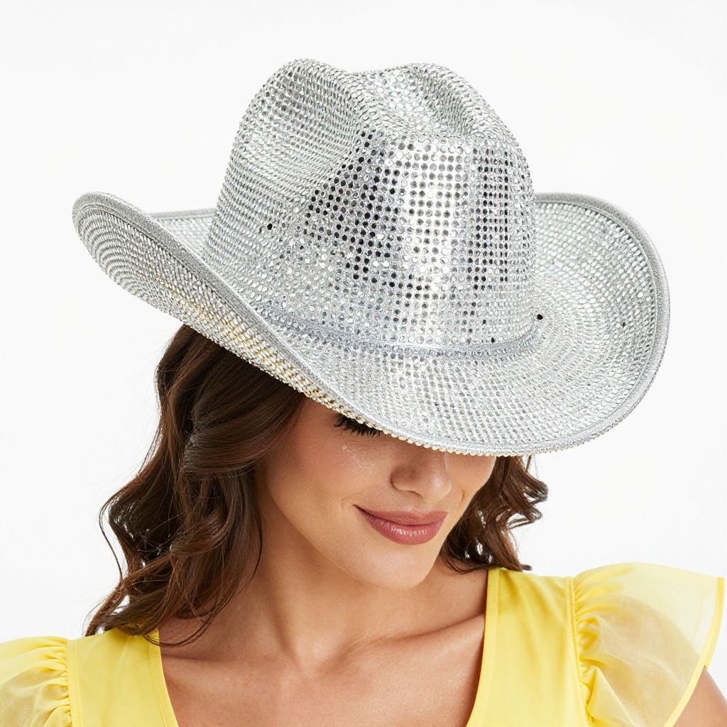 Rhinestone Cowgirl Costume, a close up of a woman wearing a hat and a yellow dress