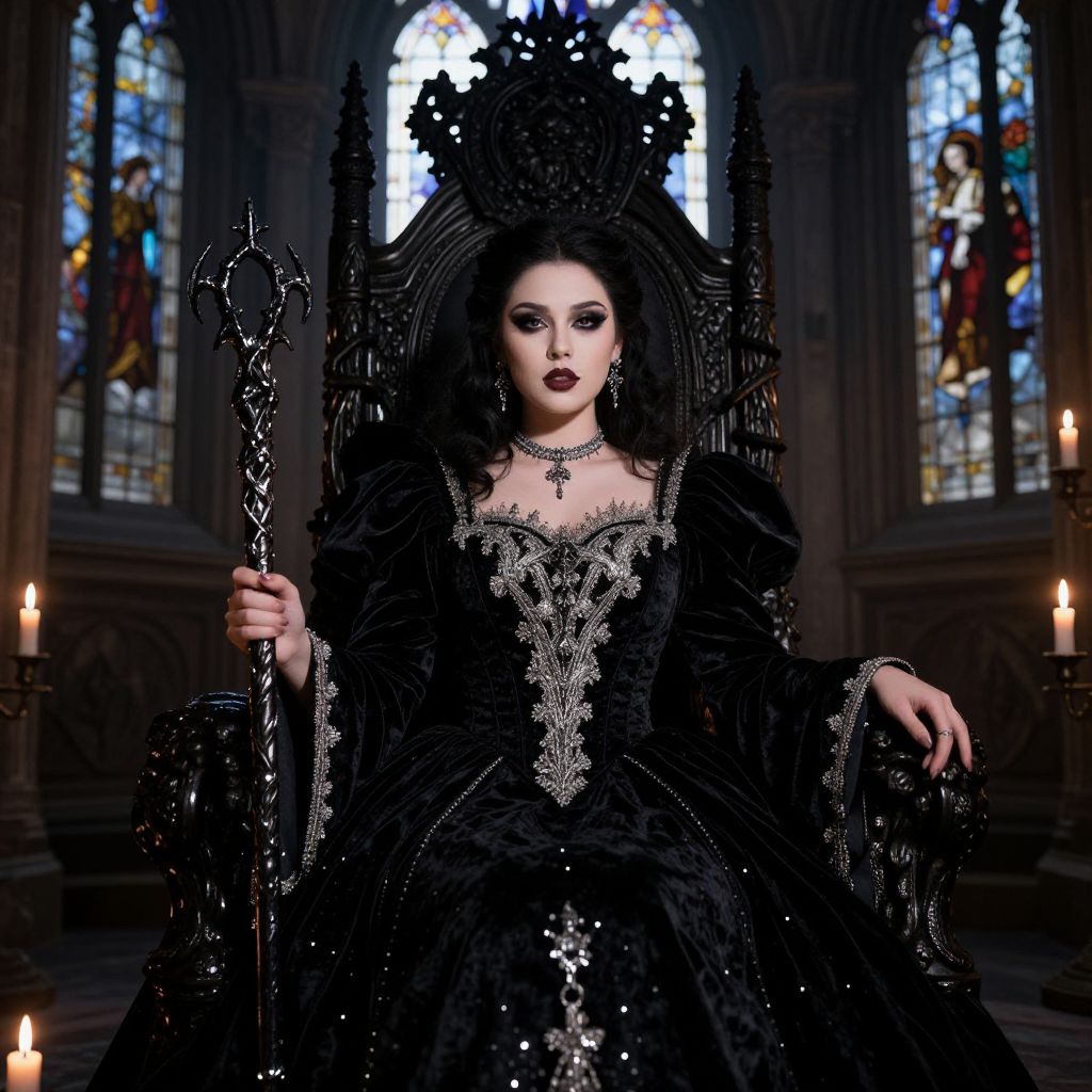 Elegant BBW gothic queen reigning in a dark castle throne room, dressed in elaborate black velvet dress with silver embroidery, smoky eye makeup, holding a gothic scepter, surrounded by flickering candles and stained glass windows, moody and regal vibe.