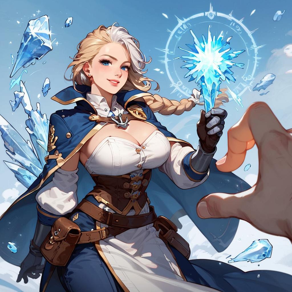 Core_9, score_8_up, score_7_up, score_6_up, score_5_up, source_cartoon, uncensored, , a girl is casting ice magic spell in dynamic pose, (casting spell, magic:1.1), close-up, epic pose, jaina proudmoore, 1girl, mature female, cowboy shot, confident, blush, smile, anchor necklace, white hair, blonde hair, single braid, streaked hair, blue eyes, detailed, corset, single pauldron, cape, cropped jacket, detached sleeves, (single gauntlet:0.9), gloves, blue pants, long skirt, belt pouch, pelvic curtain, curvy, large breasts, cleavage, outdoors, ice, twilight sky, ice block, (ice crystals:1.1), (wind:1.1), epic background, magic aura, wasteland