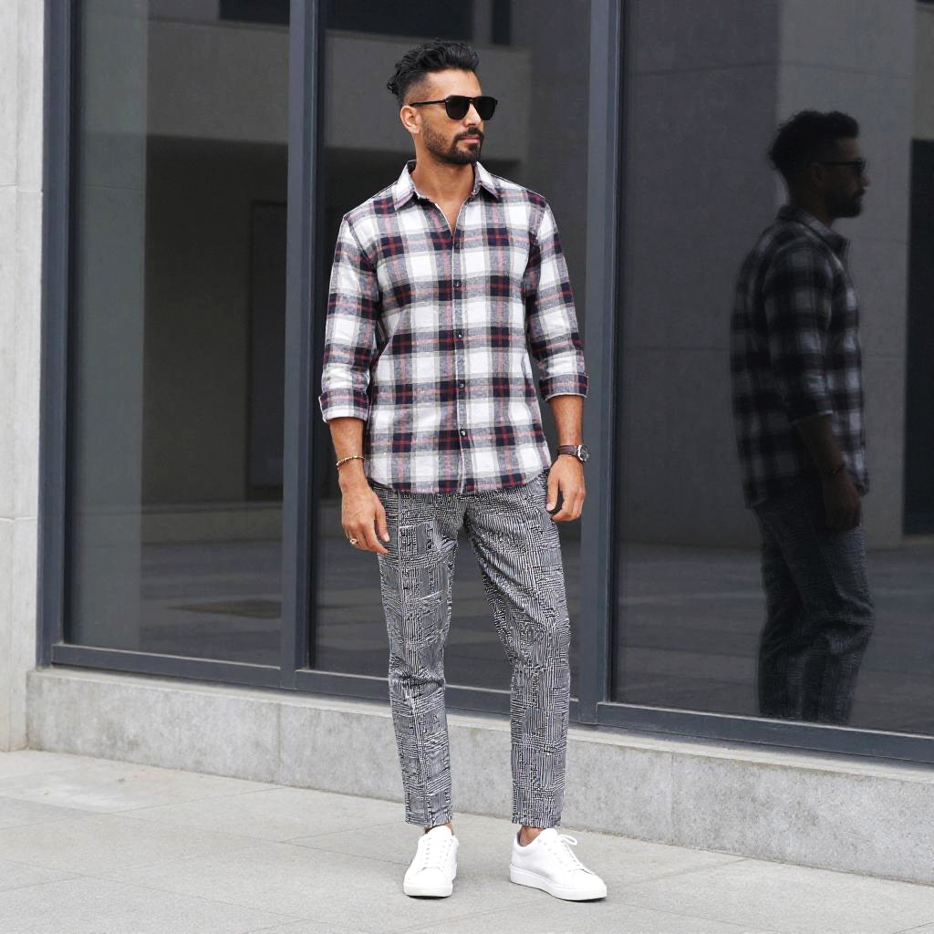A man sporting an artistic and trendy ensemble stands confidently in front of a modern building with large windows reflecting his image. His fashion-forward outfit incorporates a plaid shirt paired with patterned trousers and stylish white sneakers.