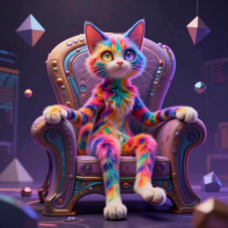 Weirdest cat ever, surreal feline with elongated limbs, vibrant multicolored fur patterns, oversized eyes glowing softly, sitting on a twisted futuristic throne surrounded by floating geometric shapes, digital art, high detail, dreamlike atmosphere.