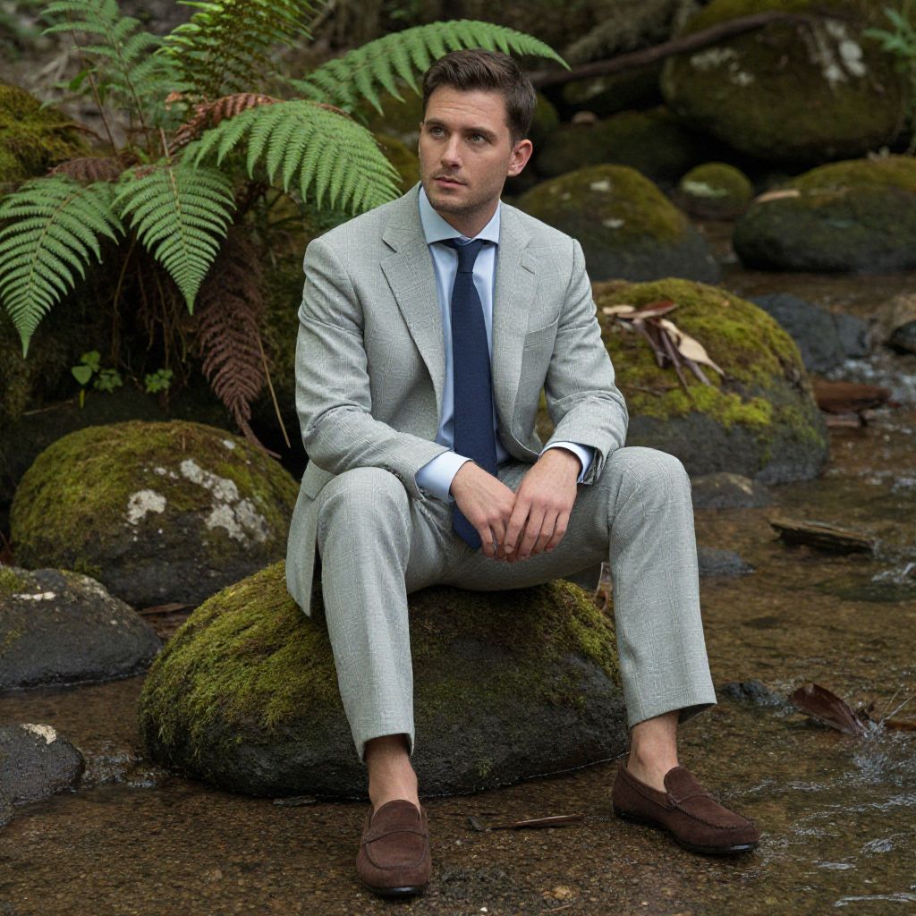 A man, light gray plaid suit, pale blue dress shirt, solid navy tie, brown suede loafers, serene creek, moss-covered rocks, vibrant ferns, hand-tinted photograph, contemplative expression. Man has masculine face and piercing eyes