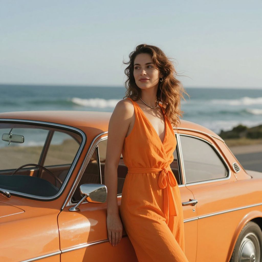 Amidst the sun-kissed embrace of the ocean and the timeless allure of a vintage car, a woman in vibrant orange exudes a sense of freedom and nostalgia, her smile hinting at the quiet joy of embracing life’s simple pleasures.