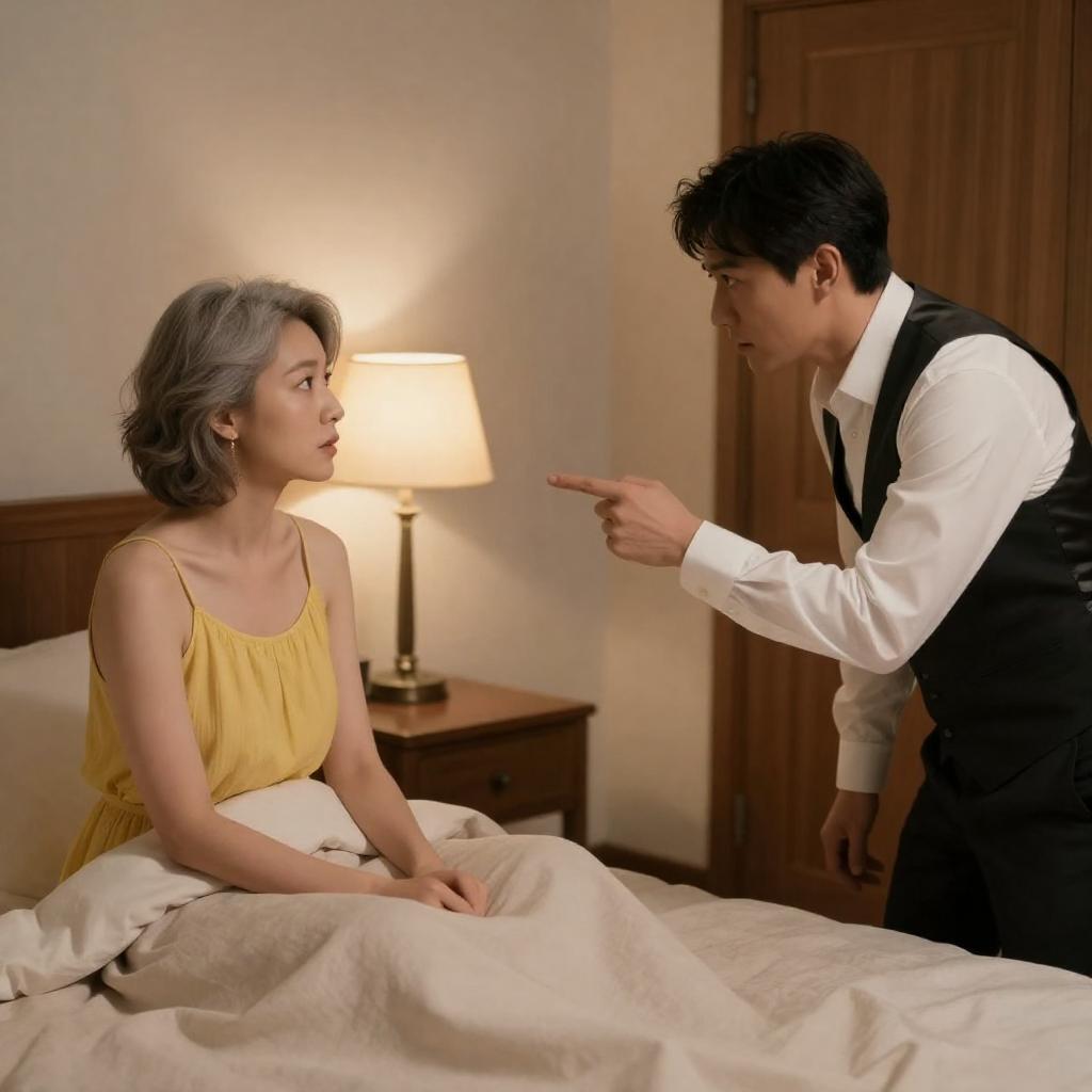 Photograph of a man and woman in a bedroom. Man in white shirt, blue pants, black tie, pointing at woman. Woman in pink floral dress, standing beside bed, looking at man. Purple curtains, yellow wall, small table with flowers.