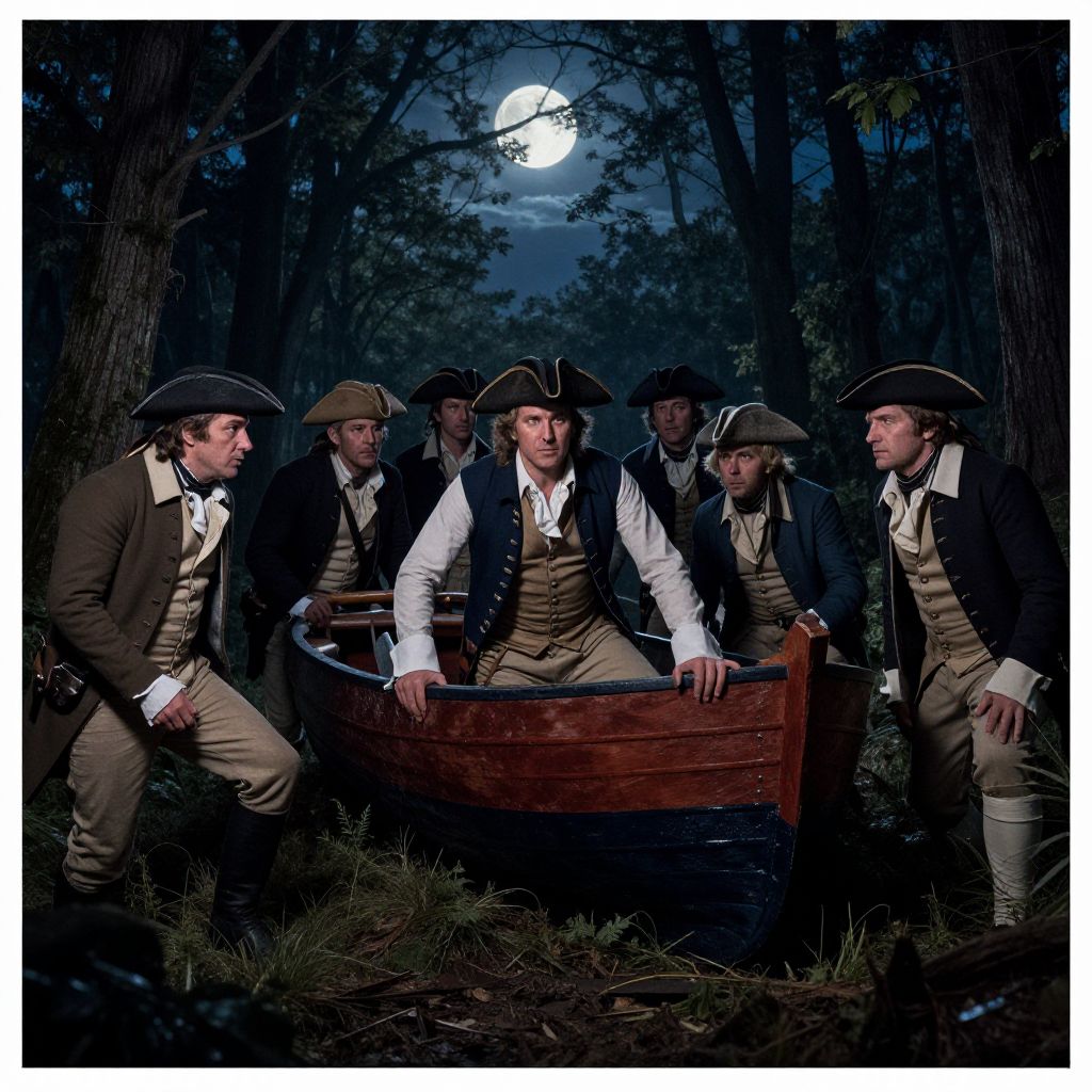 Photograph of six Caucasian men in 18th-century colonial attire, standing around a wooden rowboat at night in a forest. They wear tricorn hats, white shirts, brown vests, and beige trousers. The man in the center, with a serious expression, grips the boat. The background features tall trees and a full moon shining through the canopy. The men's faces are illuminated by moonlight, casting shadows on their rugged features. The forest floor is covered in grass and small plants. The image has a dramatic, historical feel with rich, dark colors and a high contrast between light and shadow.