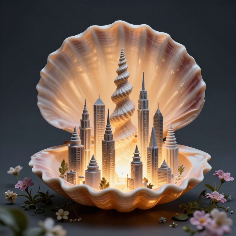 Photorealistic digital art of a glowing, illuminated cityscape with skyscrapers inside a large, scalloped seashell, surrounded by small