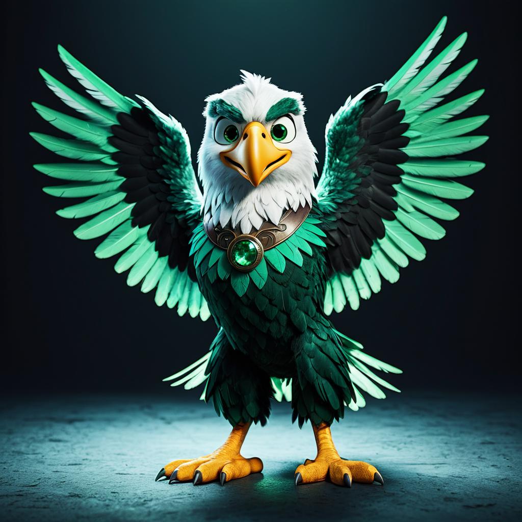 Disney Pixar character, 3D render style, eagle mascot with emerald green feathers with glowing accents, spread wings ready to take off, humanoid, cinematic colors