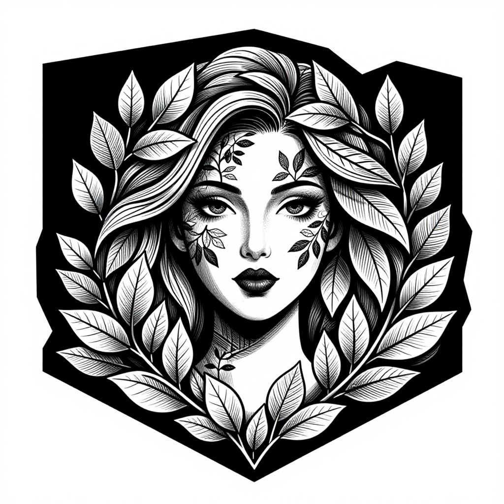 This black-and-white digital drawing features a stylized portrait of a woman with intricate leaf patterns framing her face. She has large, almond-shaped eyes, full lips, and her hair is swept back, with detailed line work creating a sense of motion. Leafy branches encircle her head, forming a symmetrical wreath-like pattern against a solid black background. The high-contrast, bold lines and hatching techniques give the image a striking, almost tattoo-like appearance. The woman's expression is neutral yet captivating, and her face is centrally positioned within an irregular hexagonal frame.