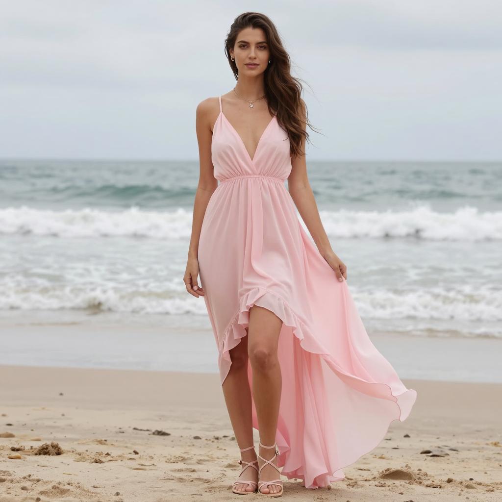 Rave apparel, photograph of a beautiful young woman, standing on a beach, wearing a flowing pink dress with a deep V-neck and a long, asymmetrical hem, long brown hair, wearing strappy sandals, holding the skirt of her dress, ocean in background, waves and cloudy sky, soft natural light, sand at her feet, casual and elegant, summer, beach setting, serene and peaceful atmosphere, model with fair skin, slender build, relaxed pose, gentle breeze, subtle color palette, soft ures