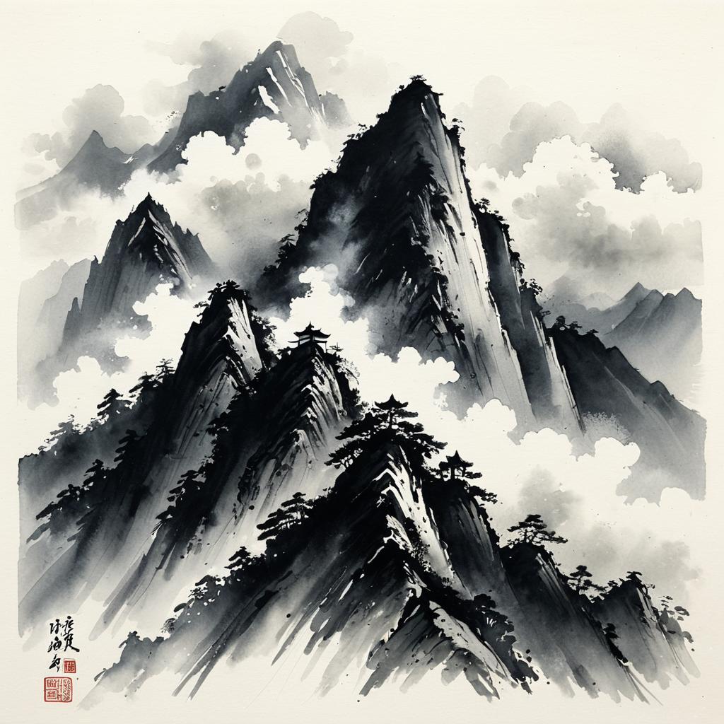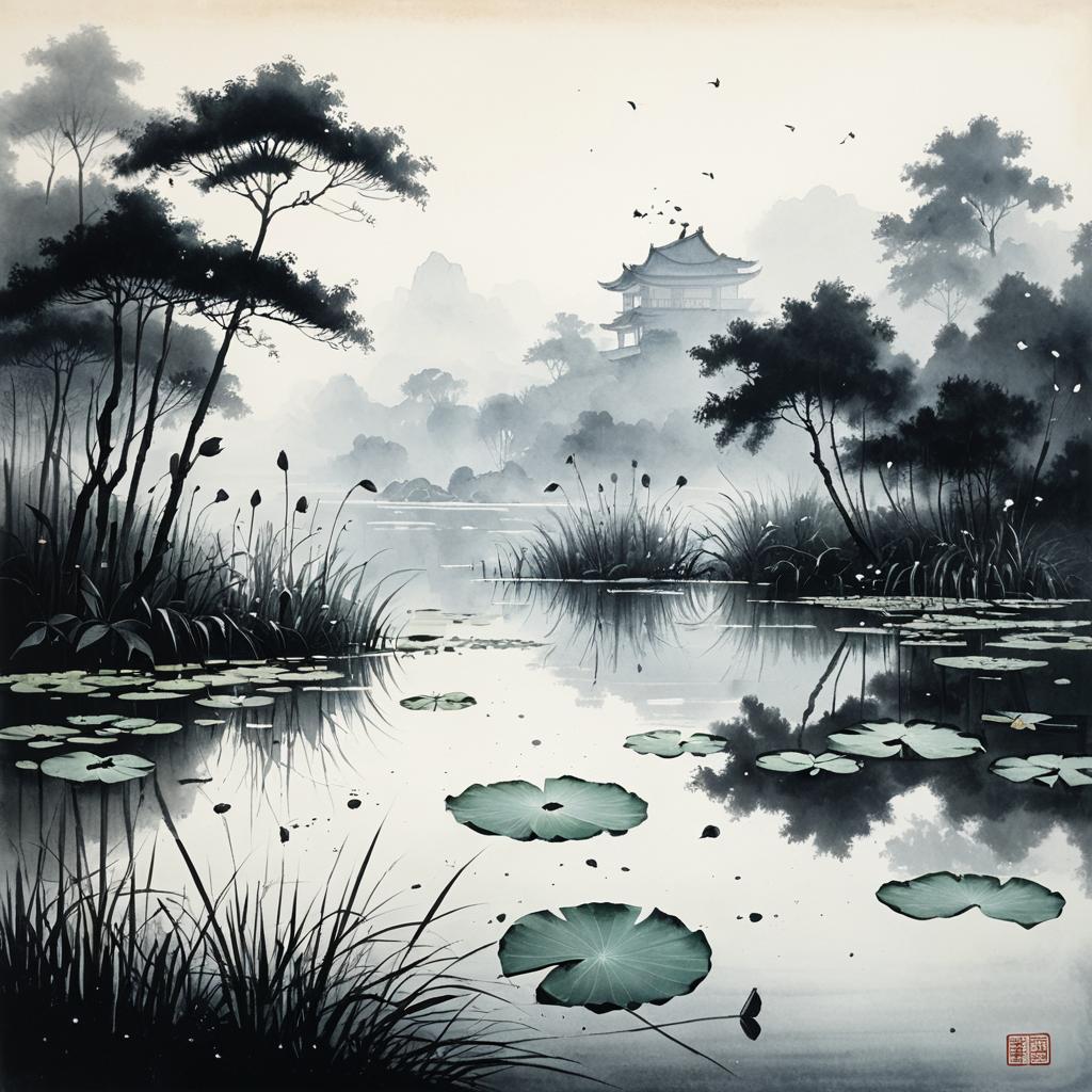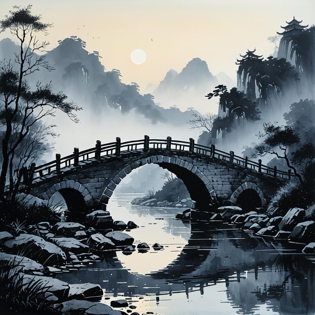 Chinese brush painting of an ancient stone bridge arched over a misty river at twilight, with fading light and drifting fog, mysterious and poetic, brush and ink techniques, traditional style