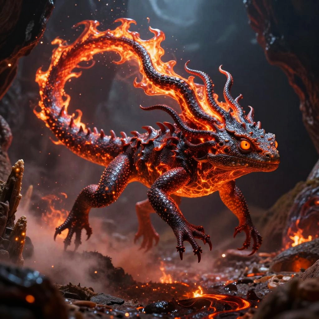Ember-lizard creature with flowing tendrils of molten lava in its mane, twisting mid-air unleashing a fiery tail whip, subterranean magma cavern with luminous stalactites, action shot, skin pores, very dark lighting, heavy shadows, detailed face, vibrant, photorealistic, dramatic, sharp focus, 8k, (intricate:1.4), decadent, (highly detailed:1.4), digital painting, concept art, octane render, artstation, smooth illustration, global illumination, studio light, volumetric light, atmospheric fog, particles floating, embers, wet surfaces, rim light, depth of field