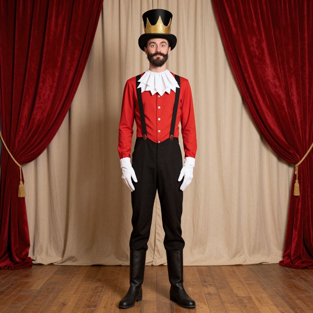 Circus tall man costume, 1boy, male focus, mustache, solo, facial hair, hat, hand in pocket, boots, curtains, standing, full body, gloves, crown, beard, long sleeves, top hat