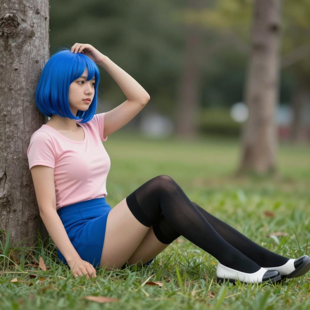 Young woman with blue bob haircut, sitting against tree trunk, wearing pink top, blue skirt, black thigh-high stockings, white and black shoes, hand in hair, legs extended, green grass background, trees, sunlight, relaxed pose.