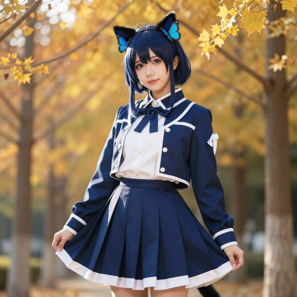 Photograph of an Asian woman cosplaying in an anime-style outfit, standing in a sunlit autumn park. She has short black hair with blue butterfly-shaped cat ears on top, and wears a navy blue and white sailor-style school uniform with a pleated skirt. The uniform features white trim and a large bow on the chest. Her expression is soft, and she holds the skirt slightly outwards. The background shows tall trees with yellow and orange autumn leaves, creating a warm and serene atmosphere. The lighting is bright, highlighting the vibrant colors.