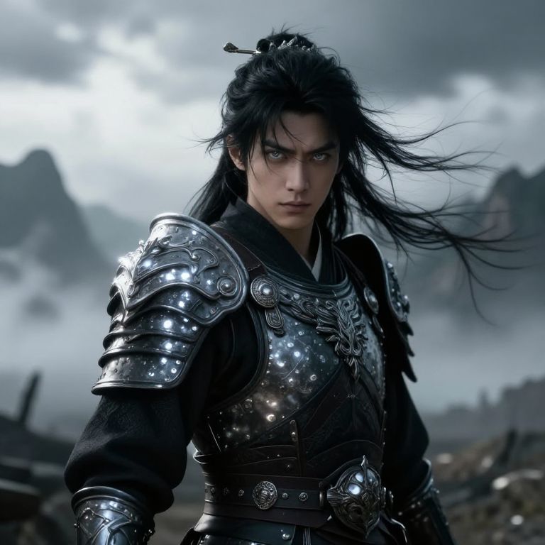 Black hair silver eyes warrior standing on a misty battlefield, detailed armor with silver ornaments reflecting light, fierce expression, wind-swept hair, epic fantasy setting with dramatic clouds and distant mountains