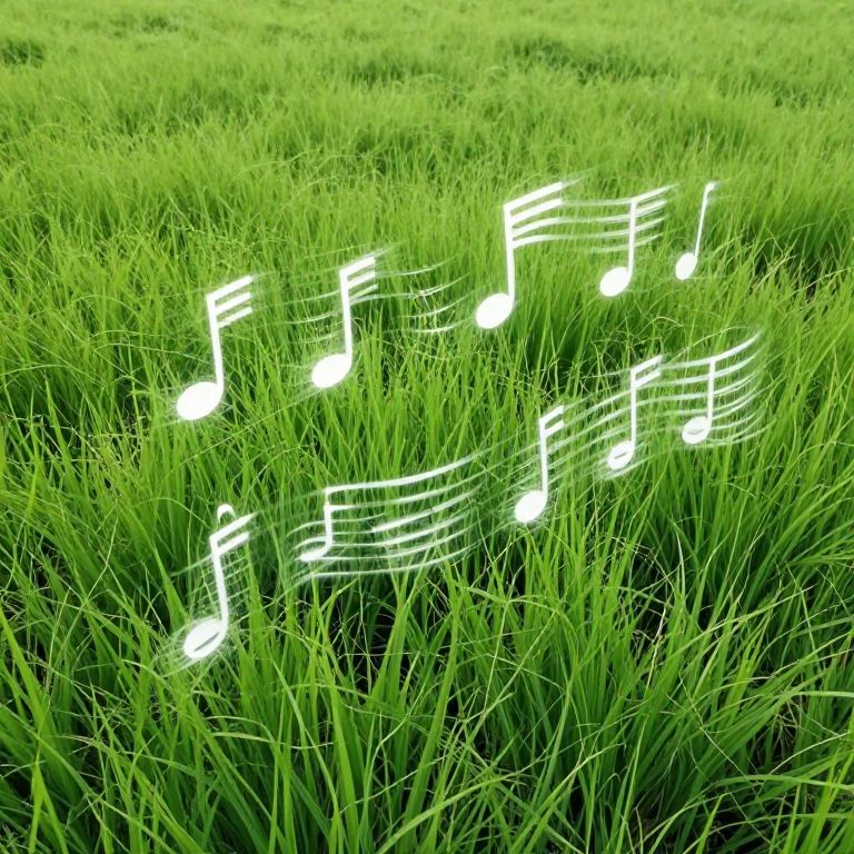 Digital image of glowing white musical notes floating on vibrant green grass, creating a lively and fresh visual effect.