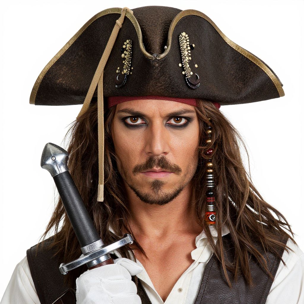 Captain hook costume adult, solo, 1boy, male focus, hat, brown hair, looking at viewer, weapon, realistic, gloves, upper body, sword, bicorne, brown eyes, white gloves, pirate, pirate hat, closed mouth