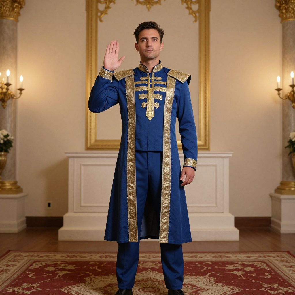 Oath Taking Attire Costume, man in a blue and gold outfit standing in a room