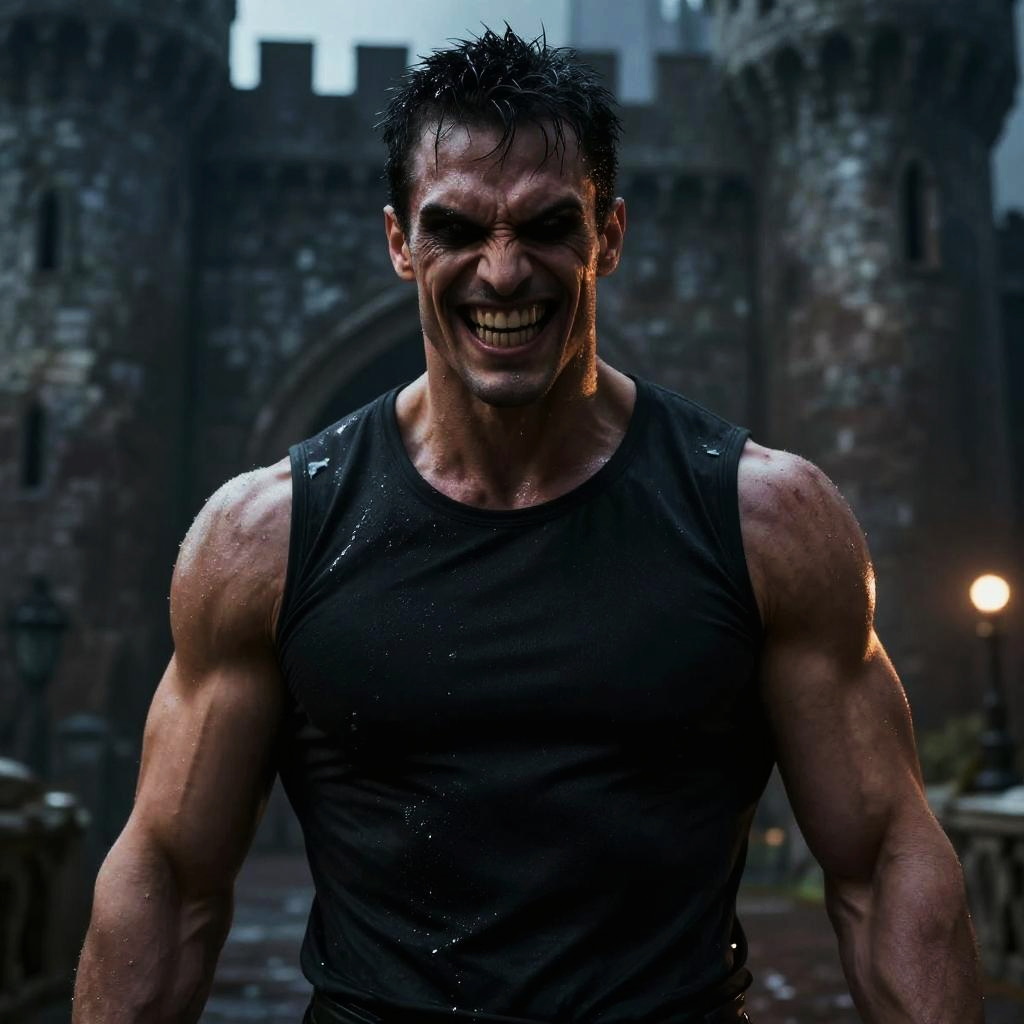Realistic photo.Ultra-realistic photo of a muscular man in a sleeveless black shirt, in a dark, cold old castle setting, wide neckline, psychotic expression with evil laughter, focus on upper body and face, dramatic lighting and wet effect on shirt, cinematic atmosphere. realistic photo
