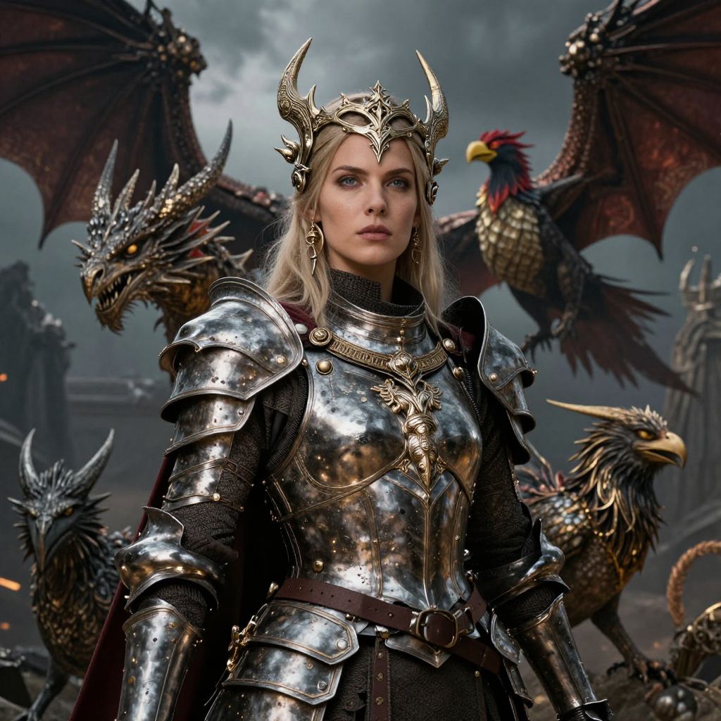 A dramatic fantasy concept art featuring a noble woman in armor, surrounded by mythical creatures like dragons and griffins, with intricate facial features and a dramatic composition.