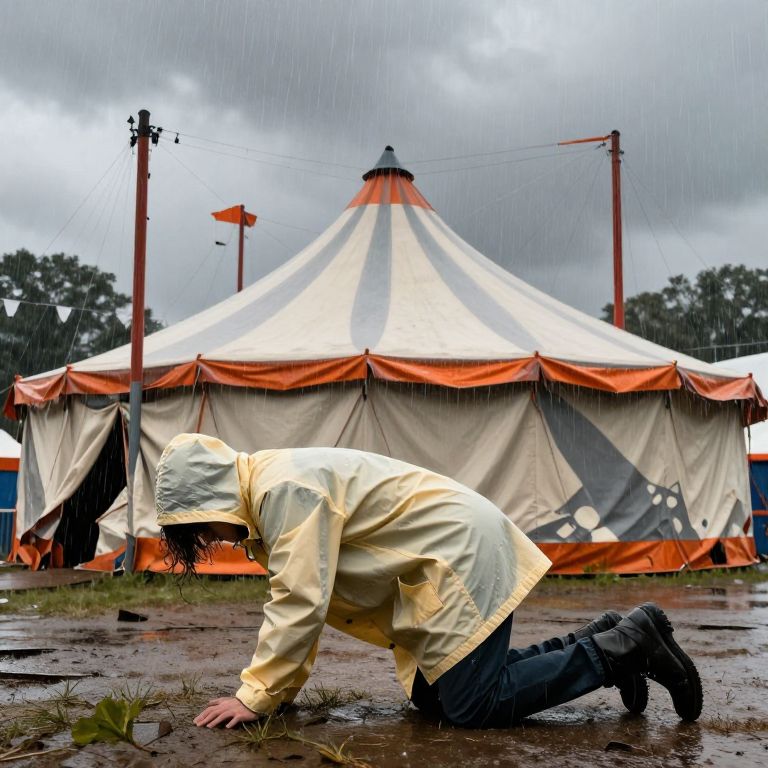 Photograph of a person in a yellow raincoat and hood, kneeling on a wet, muddy ground, facing downward. The background features a large, white and orange striped circus tent under a cloudy, rainy sky. The tent has red poles and orange trim, with grass patches and puddles visible around it. The person's posture suggests fatigue or distress, and the overall mood is somber and bleak. Raindrops are visible on the camera lens, adding to the wet, dreary atmosphere.