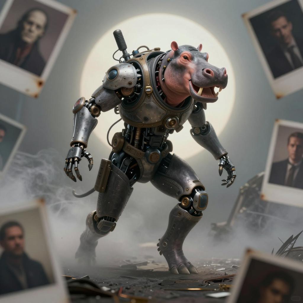 Highly detailed digital illustration of a humanoid hippopotamus cybernetic space mercenary inspired by D&D Giff and cyberpunk aesthetics. The character features a mechanical body with intricate metallic parts and a realistic hippo head, set against a foggy, cinematic background with dramatic lighting and a spotlight effect. Surrounding the figure are blurred old-style polaroid photos, enhancing the vintage, film archive feel. The artwork exhibits deep shadows, volumetric light, and complex textures, blending sci-fi and fantasy elements.