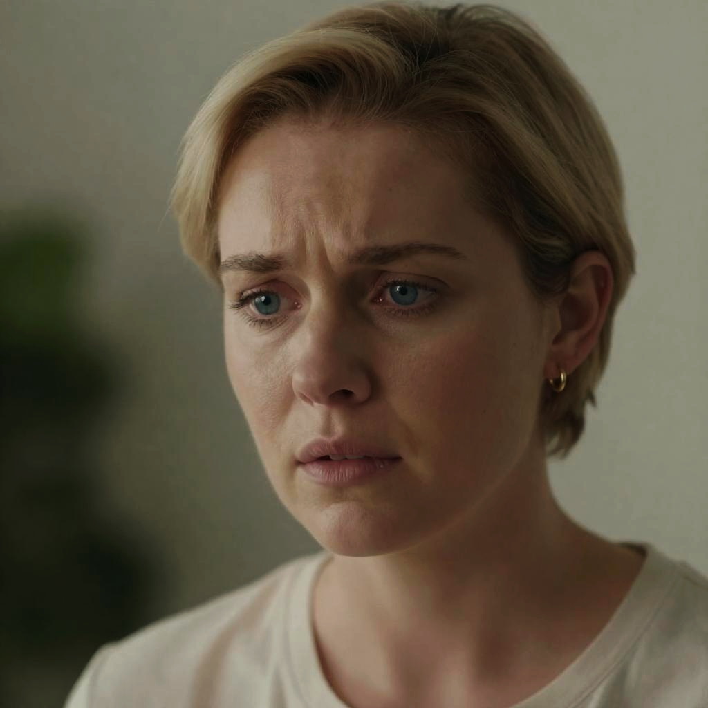 Photograph of a blonde woman with shoulder-length hair, wearing a black tank top, looking to the right with a slightly concerned expression. Green and yellow lighting creates dramatic shadows on her face. Background is dark and blurred. She is the only person in the image.