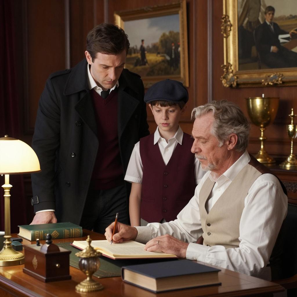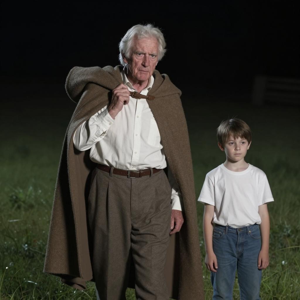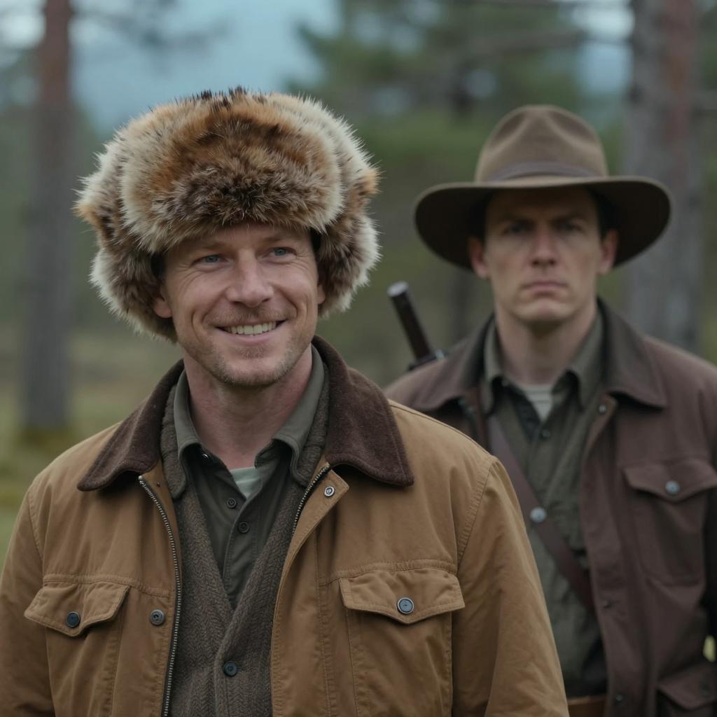 A man and a boy outdoors. The man, with blond hair, wears a black hat and brown coat, looking at the boy. The boy, with brown hair, wears a blue and orange jacket and a blue cap, touching the man's shoulder. Green trees in the background. The man has a neutral expression, while the boy looks slightly serious. Two people, close-up, upper bodies.
