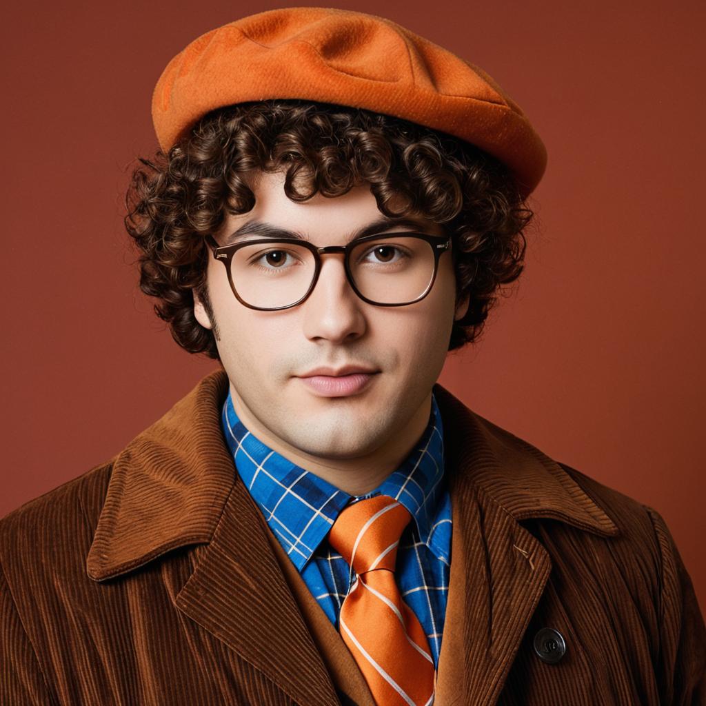 Studio portrait of a young man with curly brown hair wearing glasses, an orange beret, a brown corduroy coat, a blue plaid shirt, and an orange striped tie. The subject is posed against a brown background, styled in a vintage, retro fashion.
