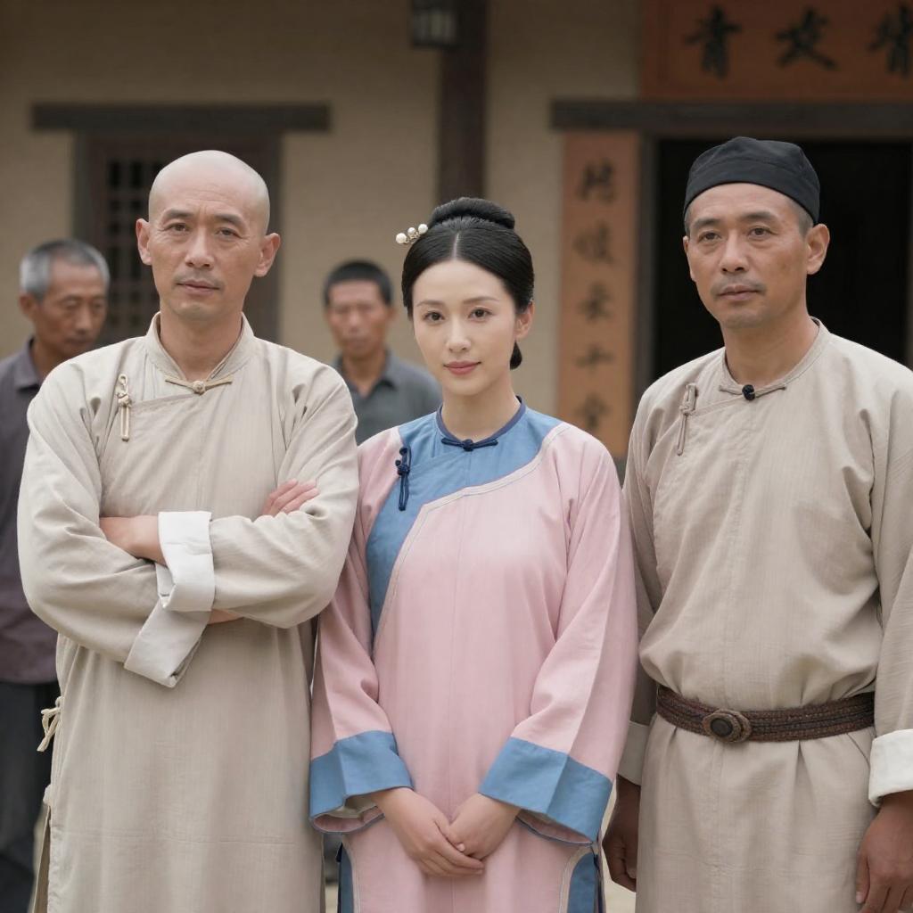 Photograph of three Asian individuals in traditional clothing in front of a rustic building. The man on the left is bald, wearing a beige robe, arms crossed. The woman in the center has black hair in a bun, wearing a pink robe with blue trim. The man on the right wears a black cap and beige robe. Background includes older men and a building with a sign. Daylight, neutral colors.