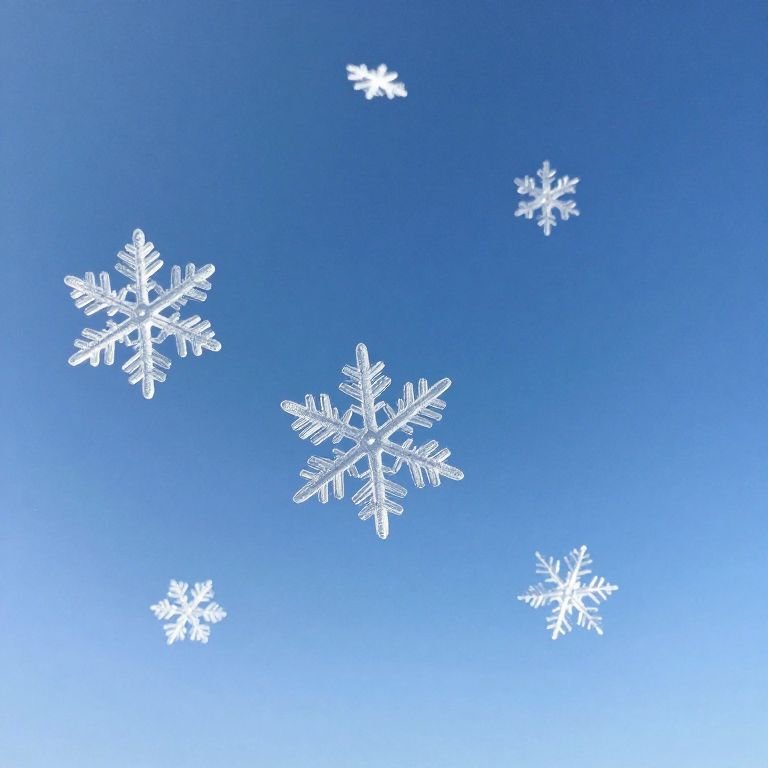 Digital illustration of five white snowflakes of varying sizes against a gradient blue background, resembling a clear winter sky.
