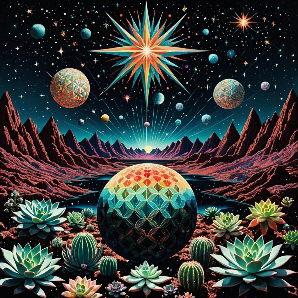 Surreal underwater city, distant kaleidoscope planet, refracted sunlight, inspired by Yayoi Kusama, intricate patterns, colorful universe, cosmic composition, dynamic and imaginative.