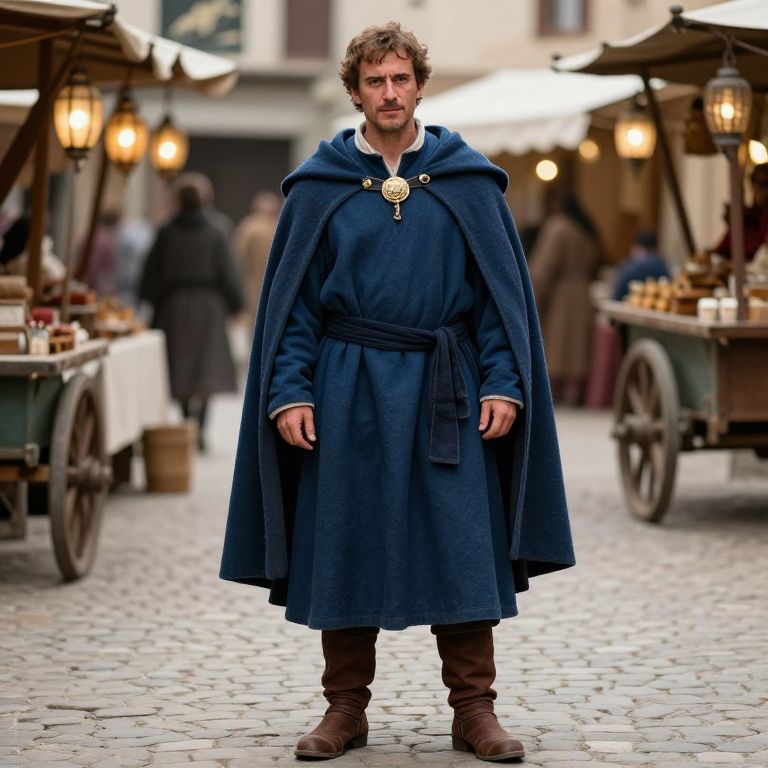 A photorealistic portrayal of a traveling merchant in Middle Ages clothing, dressed in a long dark blue tunic with a wide sash, a woolen cloak with a golden brooch, and leather working boots, standing in a bustling market square with lanterns, carts, and stalls, his face showing a sharp, alert expression with strong eyebrows and a slightly weathered complexion.
